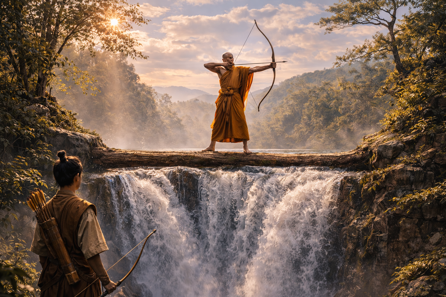 Curious and confident, the champion climbed behind him. They walked until they reached a narrow chasm bridged by a shaky, flimsy log. The master stepped carefully onto the bridge, balanced himself in the middle, and picked out a distant tree as his target. Without hesitation, he drew his bow and released an arrow that struck the tree cleanly.